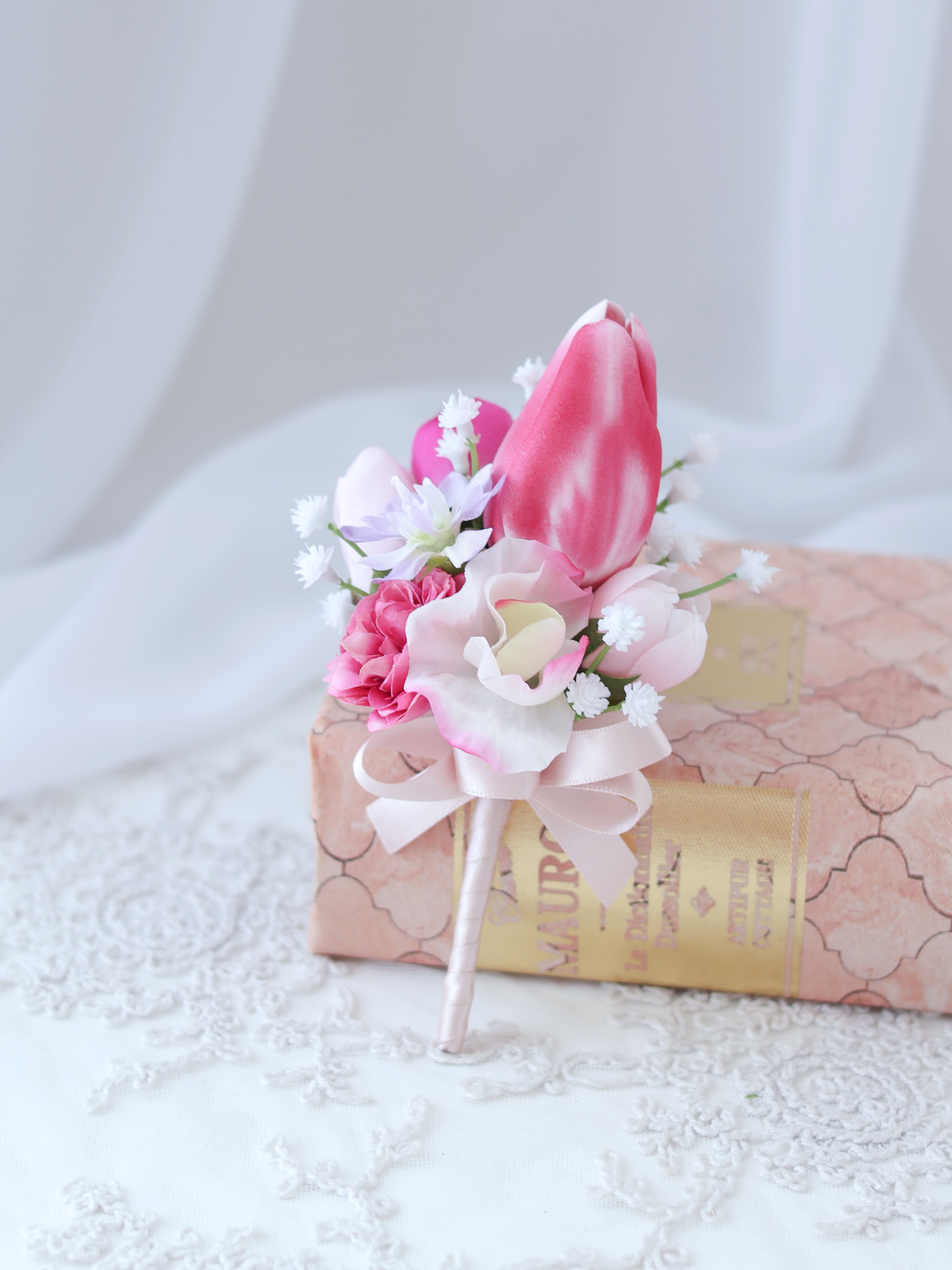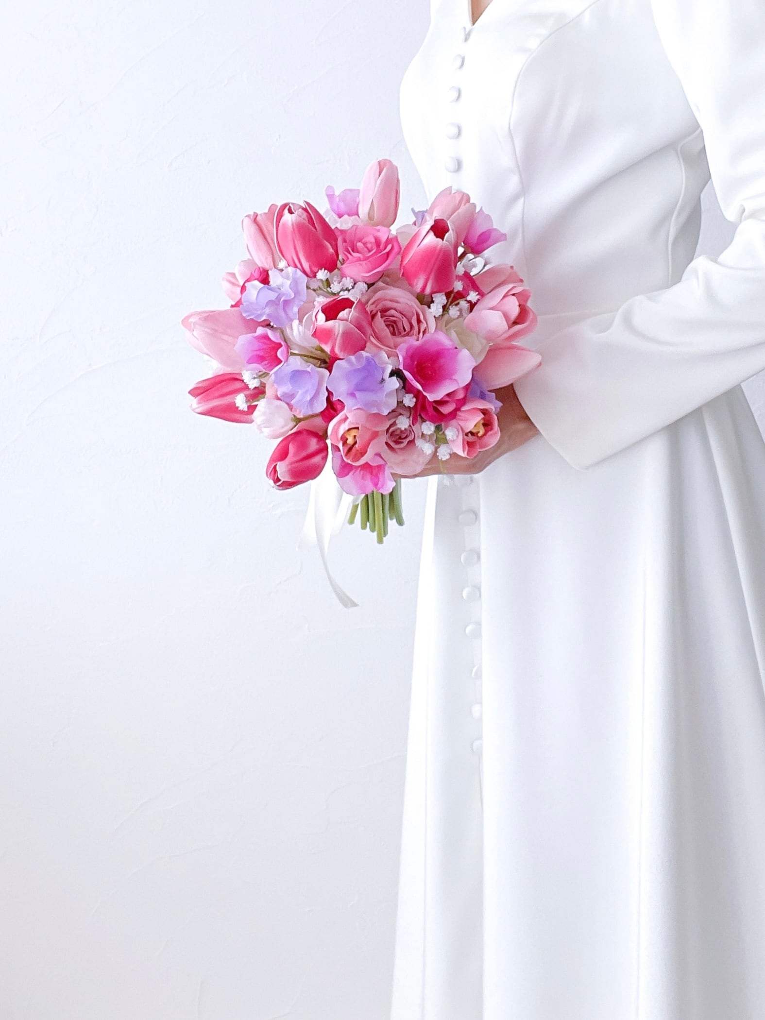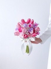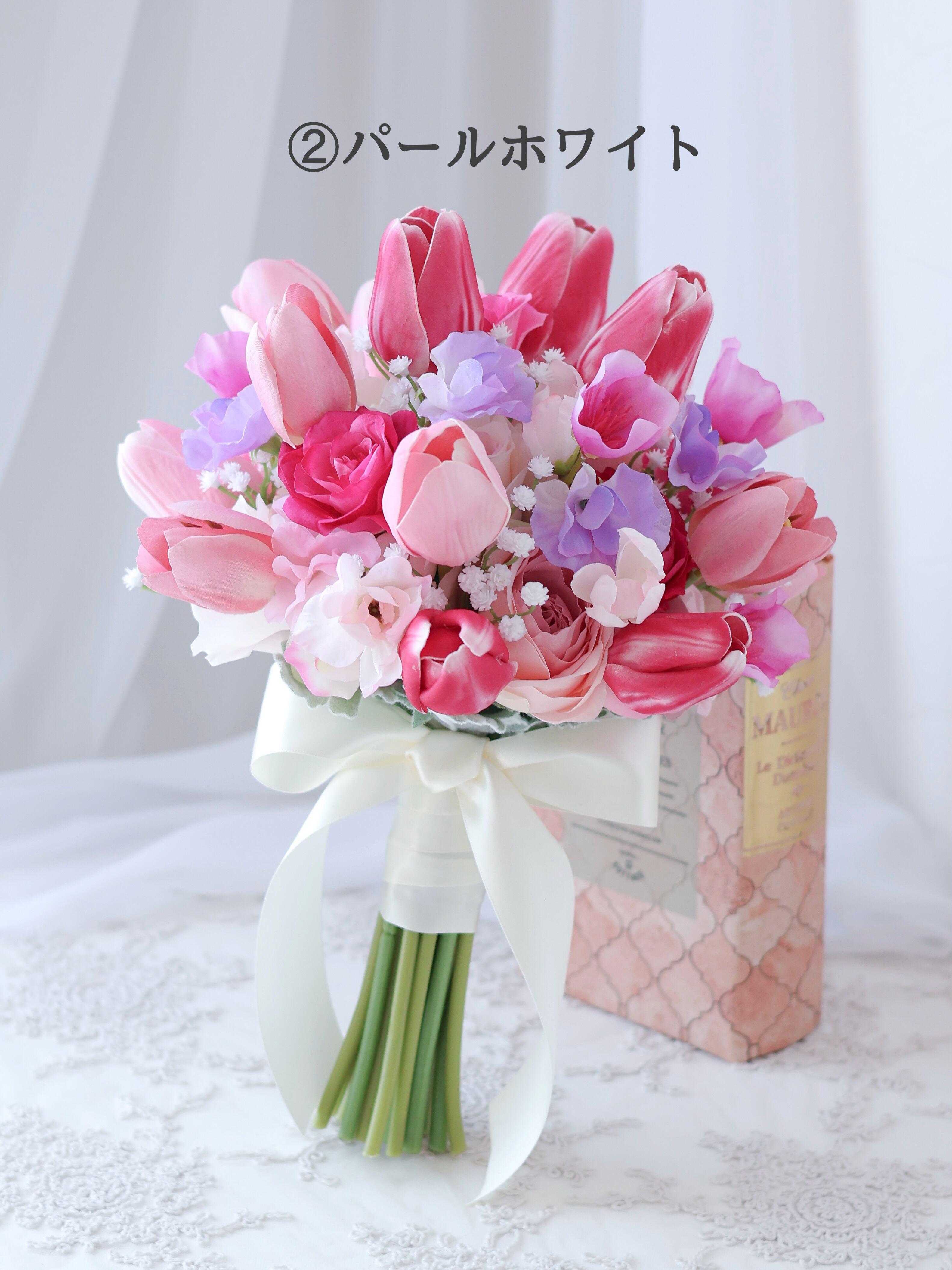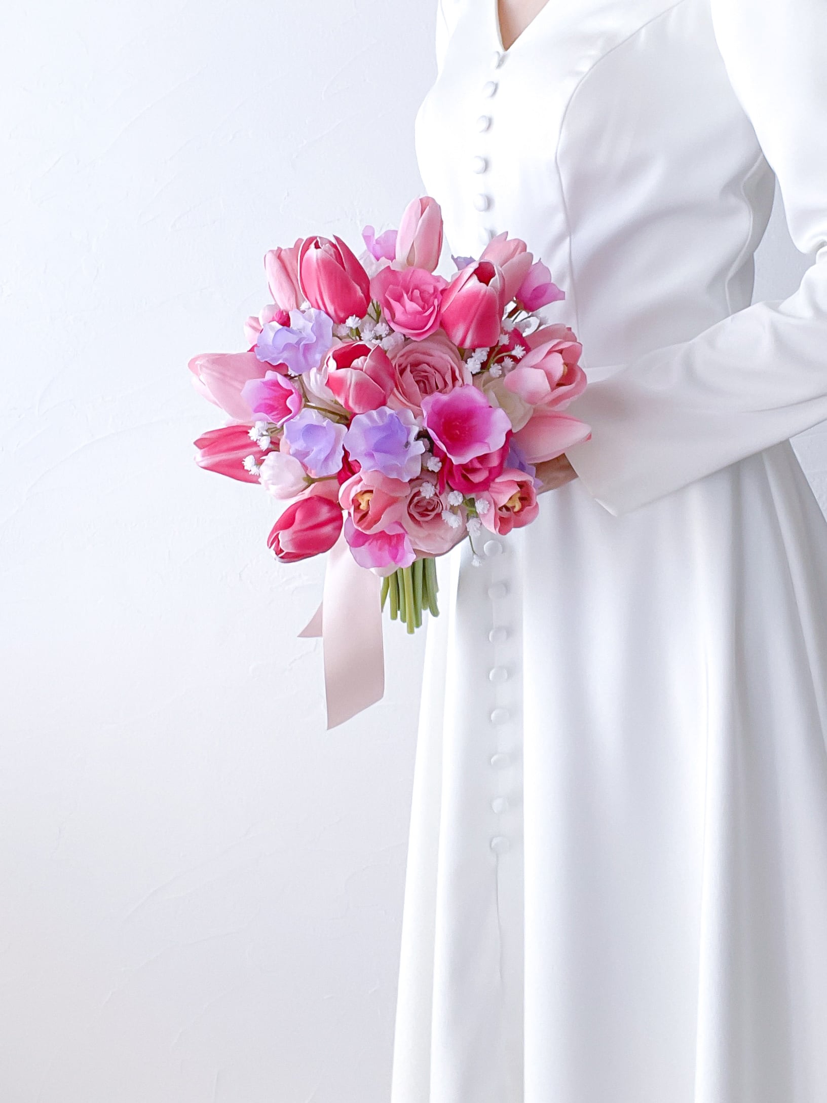 華やかなピンク色の愛らしいチューリップブーケ!まるで春が訪れたかのような、心躍る可愛らしさが魅力です!どんなシーンでも華やかに演出し、花嫁様の特別な一日を彩ります。ラウンドタイプのブーケはさまざまなドレススタイルとの相性も抜群です。