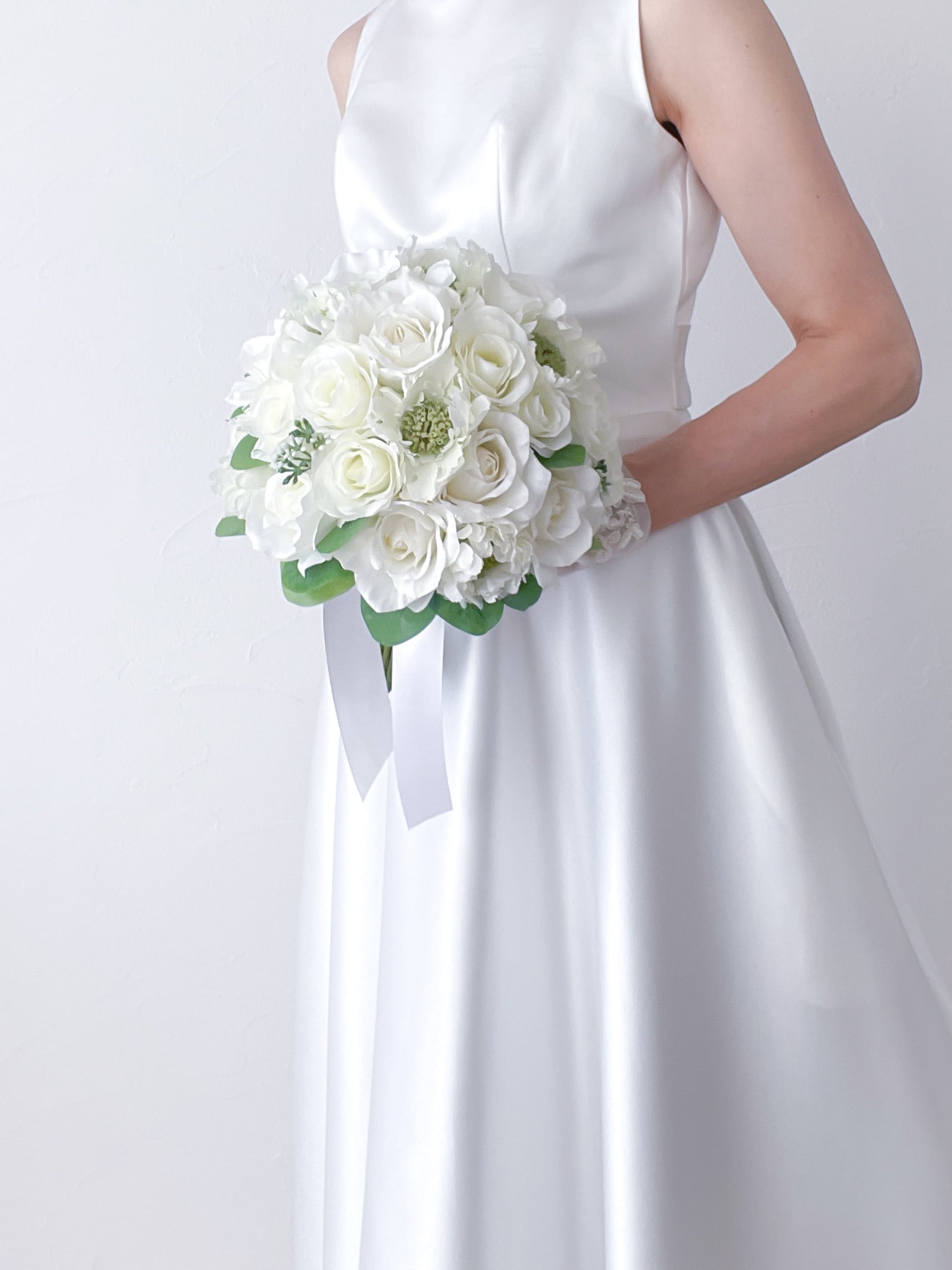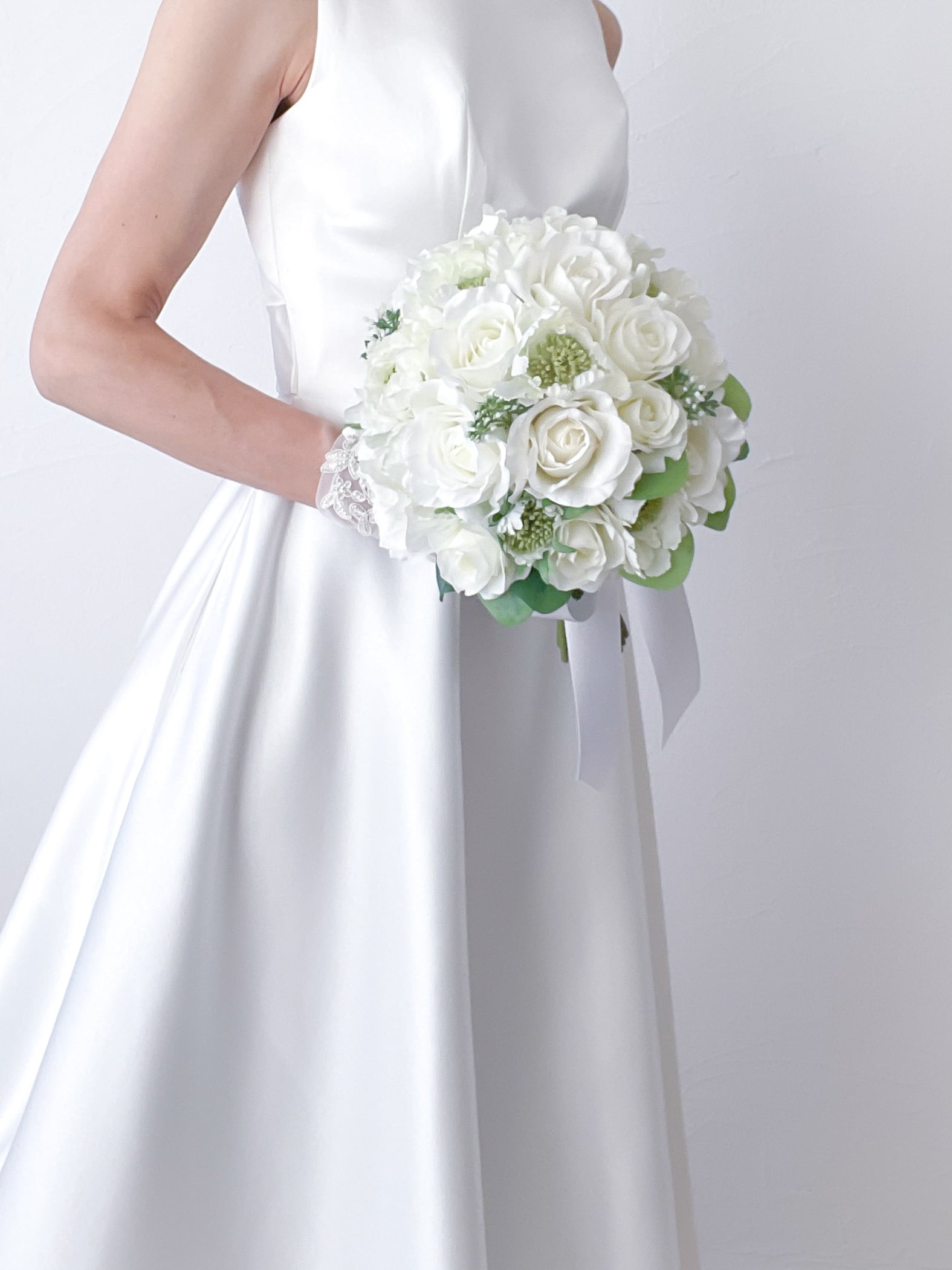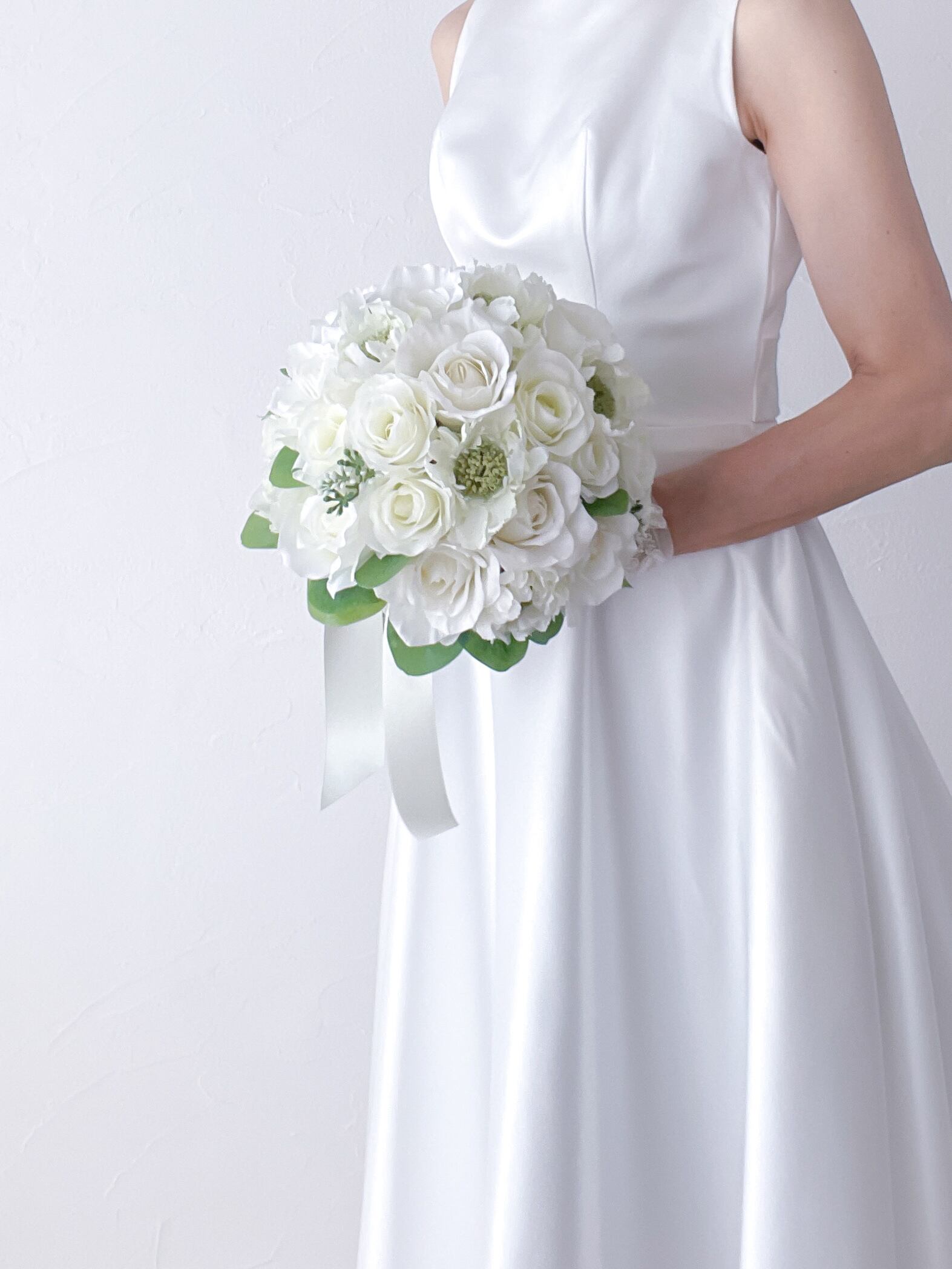ホワイトグリーンのラウンドクラッチブーケ。スカビオサと数種類の白いバラ、そこに鮮やかなグリーンを足してナチュラルに仕上げました。上品さや優雅さ、可愛らしさの魅力をたっぷりと味わえる作品です。ラウンドタイプのブーケはさまざまなドレススタイルとの相性抜群です。