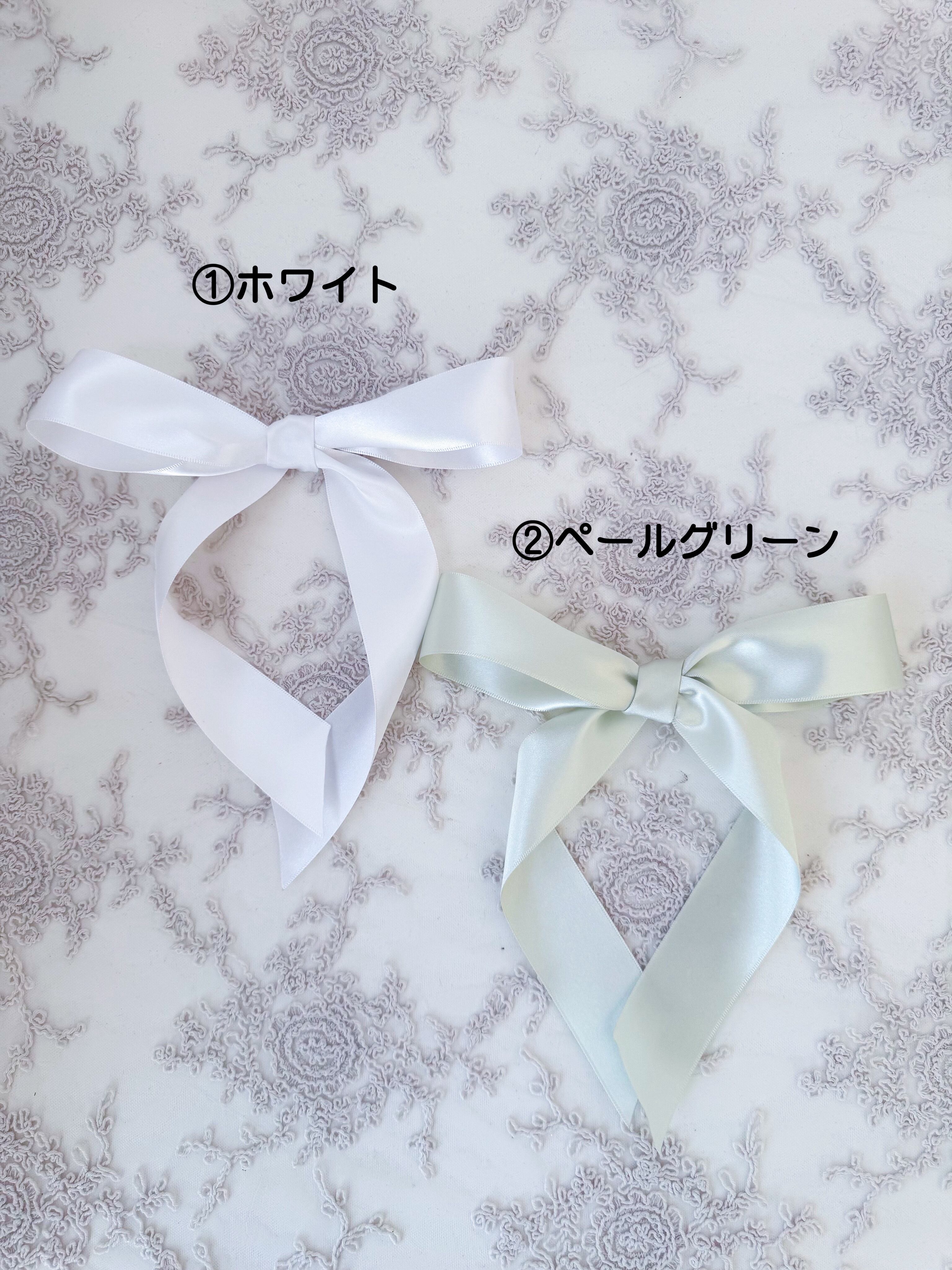 ・リボンは①ホワイト②ペールグリーンよりお選び頂けます。②ペールグリーンは柔らかな薄い緑色になります。撮影角度により白っぽく見える事もありますのでリボンの比較画像を参考にしてください。