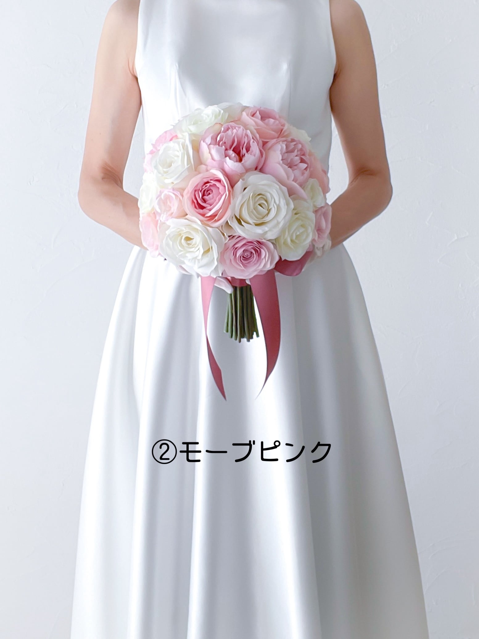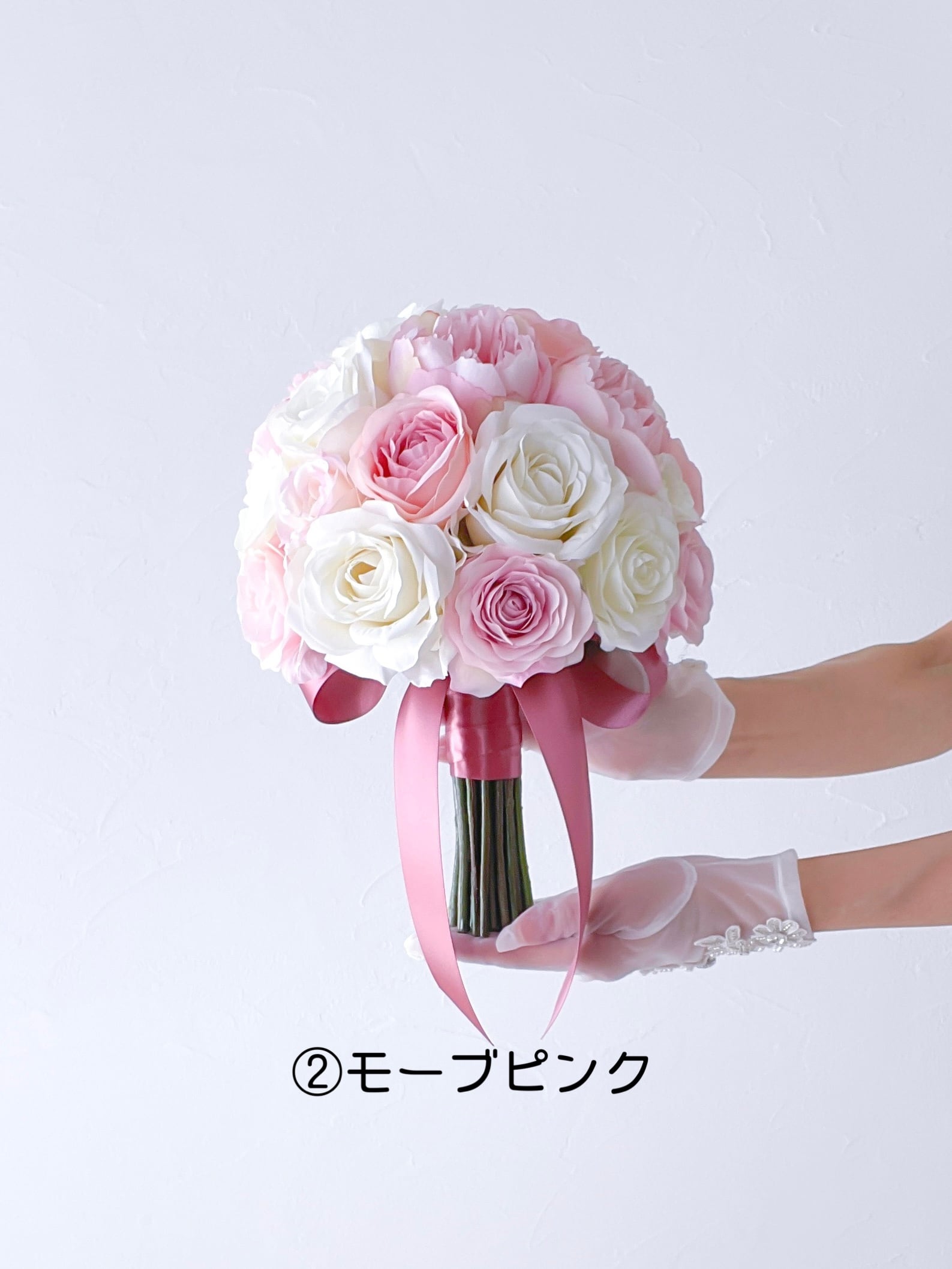 リボンは①パールホワイト②モーブピンクよりお選びいただけます。それぞれの参考画像をご覧ください。