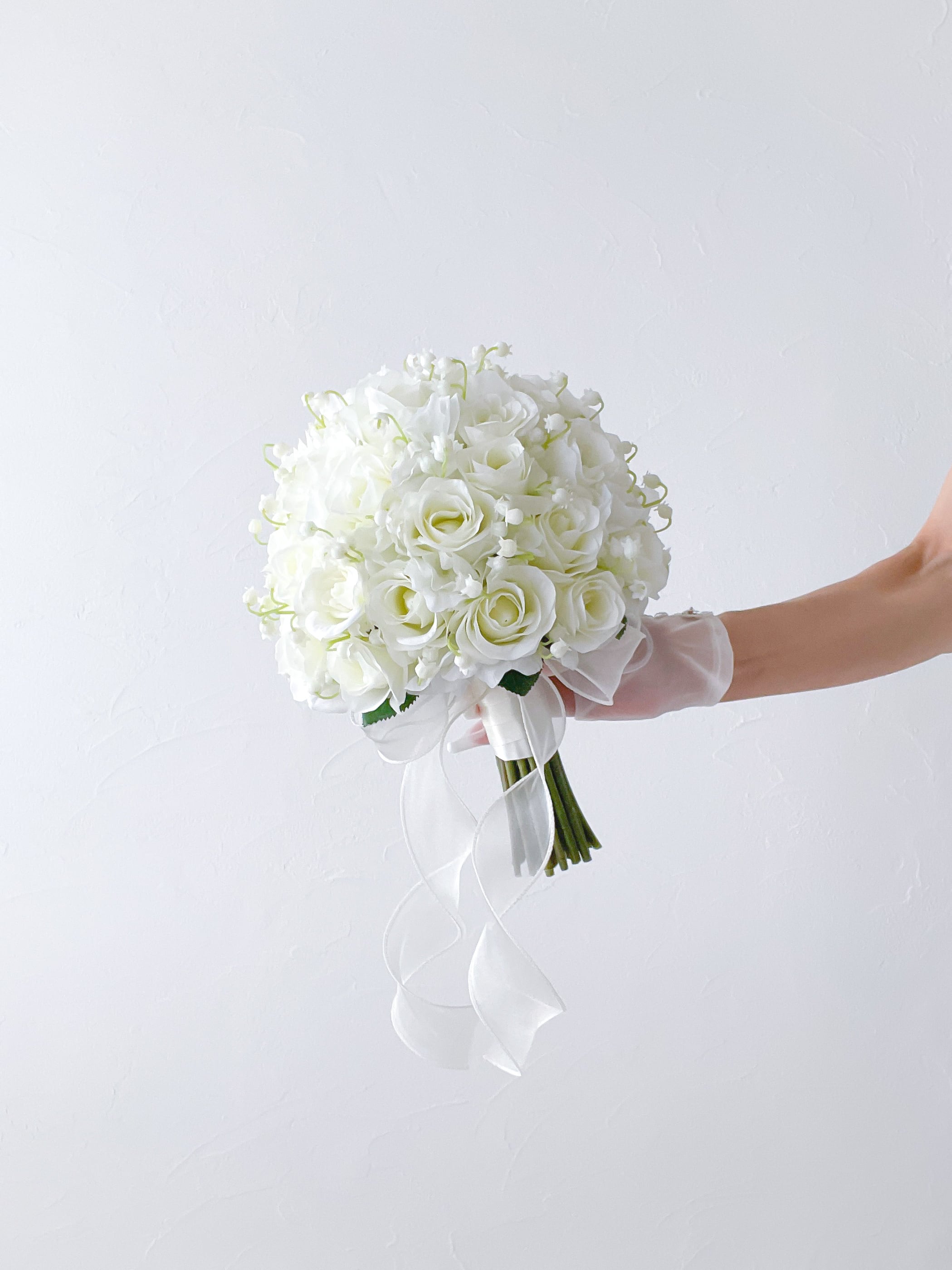 バラとスズランを使ったラウンドクラッチブーケ「フェアリー」。チラチラと見える可憐なスズランと白バラの組み合わせは上品で可愛らしい印象を与えます。透明感を感じるブーケはまるで妖精のよう!花嫁様をより美しく引き立てます。透け感のあるオーガンジー素材のリボンで優しさをプラス!特別な日を彩るブーケにいかがでしょうか。